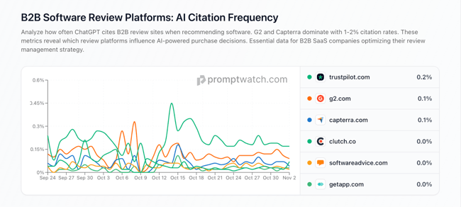 PromptWatch tracked more than 100 million citations and clicks, and listed G2 as the most visible B2B software review platform.