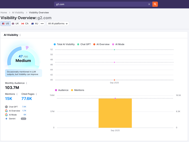 According to Semrush’s AI Visibility Toolkit, Jana Garanko, Head of PR at Semrush, highlighted that G2’s AI visibility peaks in the U.S. (47/100) but is comparatively lower across the U.K. (35/100) and Spain (30/100).