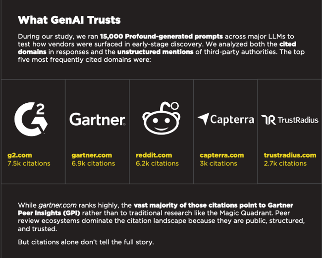 Profound’s Trevor adds that G2’s high-trust UGC gives LLMs the confidence to cite its data as a reliable source across categories — a key differentiator in an era where AI systems increasingly rely on structured, consensus-driven information.