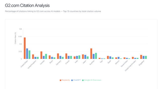 While the EMEA region still reflects lower citation volumes — consistent with slower AI integration — the data suggests that G2’s authority, structured comparative content, and user-generated reviews give it a strong foundation for visibility gains as these markets evolve.