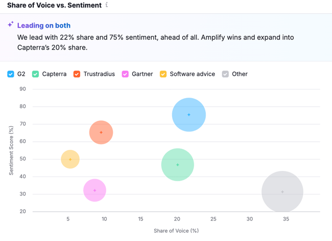 “Globally, G2 also leads the category in share of voice (22–23%) and sentiment (56–75%), ahead of Capterra’s ~20% share; meaning it’s not only more visible but also perceived more positively in AI-generated responses.”