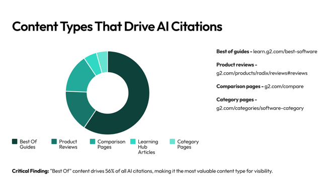 Radix’s latest study identified G2 content types that drive citations in AI LLMs. Content that aligns with the journey of software buyers and helps them inform shortlists, as well as take the next step, adds to G2’s AI LLM citation appeal.