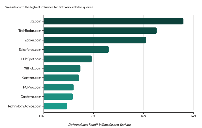 Radix analyzed 10K+ searches across ChatGPT, Perplexity, and Google AI Overviews and found G2 has the highest influence for software-related queries (22.4 % share of voice).