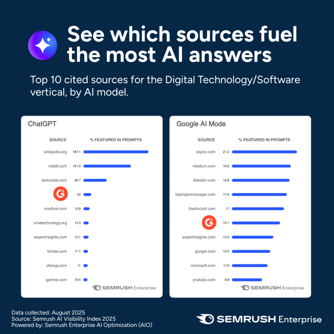 Back in October, Semrush’s AI Visibility Index had ranked G2 as one of the top cited sources fueling ChatGPT & Google AI Mode (within the digital tech/software vertical).